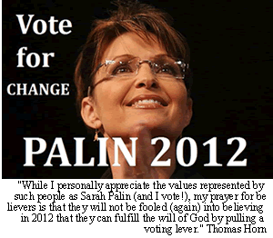 "While I personally appreciate the values represented by such people as Sarah Palin (and I vote!), my prayer for believers is that they will not be fooled (again) into believing in 2012 that they can fulfill the will of God by pulling a voting lever." Thomas Horn