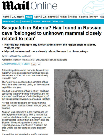 In October 2012, a headline in the UK’s Mail Online read: “Sasquatch in Siberia? Hair Found in Russian Cave ‘Belonged to Unknown Mammal Closely Related to Man.’” The story claimed that DNA tests on suspected “Yeti hair” found in a Siberian cave during an international expedition in 2011 was of an unknown mammal closely related to man, but not a human. Nor did the hair belong to any known animal from the region such as a bear, wolf, or goat, the article said. Analysis was conducted in Russia and the US, which “agreed the hair came from a human-like creature which is not a Homo sapien yet is more closely related to man than a monkey.”[vii]