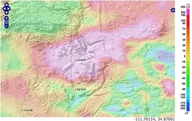 As expected, volcanic regions produce distinctive magnetic anomalies, high in amplitude and short in wavelength. These anomalies are particularly evident over much of Lonesome Valley, the Black Hills and the area between Cornville and Sedona. For example, the preexisting regional coverage indicates only a broad magnetic high in the Page Springs area. Virtually all of the individual magnetic anomalies seen in the new high-resolution data are absent in the pre-existing regional coverage. Large magnetic highs are present over the weakly magnetic Paleozoic sedimentary rocks exposed on Big Black Mesa and in the vicinity of Sedona.[vi] (emphasis added)